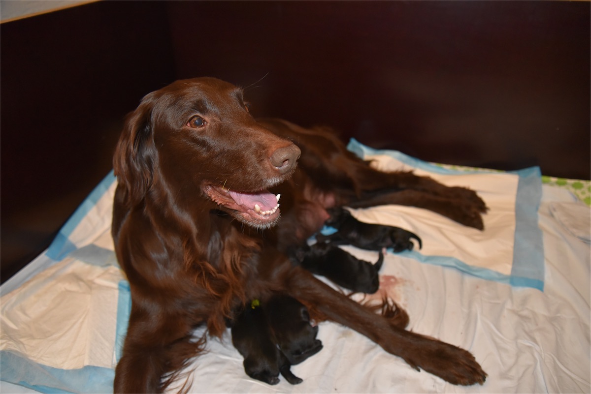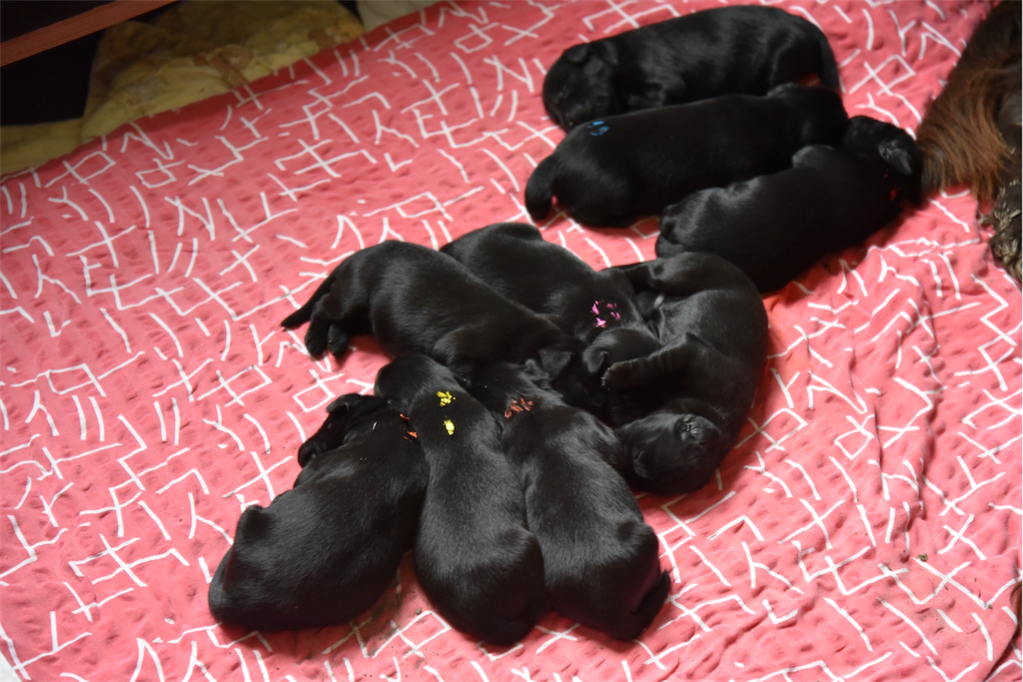 27.1.2017: Von Gestern auf heute sind unsere Tausendsassas geboren! Wir sind sehr glücklich, dass wieder einmal alles gut verlaufen ist und alle Welpen und Lolle wohl auf sind! Diesmal durften wir auch ein Wunder erleben, denn Welpe Nummer 9 ist erst heute morgen geboren und Welpe Nummer 8 um 0:15. Ich hatte die ganze Zeit im Gefühl, dass da noch ein Welpe ist, aber dies kann man nie mit Sicherheit sagen, ohne zu Röntgen. So bin ich bis 4:45 Uhr wach geblieben und dann an der Kiste auf meiner Matratze doch eingeschlafen, morgens um 8 Uhr haben wir noch 8 Welpen gezählt und um 9 Uhr, als ich die Kleinen in einen Korb legen wollte um die Decken in der Wurfkiste zu erneuern waren es 9! Ich habe noch nie so oft bis 9 gezählt……und was für ein quirliges Mädchen Hündin braun ist! Es geschehen doch Wunder! Während der Geburt hatten wir Hilfe von Thorsten, Besitzer von Papa Ari, der natürlich einen kleinen Sohn von Ari haben möchte. Man kann sich vorstellen, wie froh wir waren, als Welpe Nr.8 endlich ein Rüde war! Wir haben 8 Hündinnen und 1 Rüden! Es war wieder ein aufregendes, tolles Erlebnis! Lolle hat alles super instinktsicher gemeistert! Aber hier nun endlich die Fotos, denn wie immer sagen Bilder mehr als Worte….