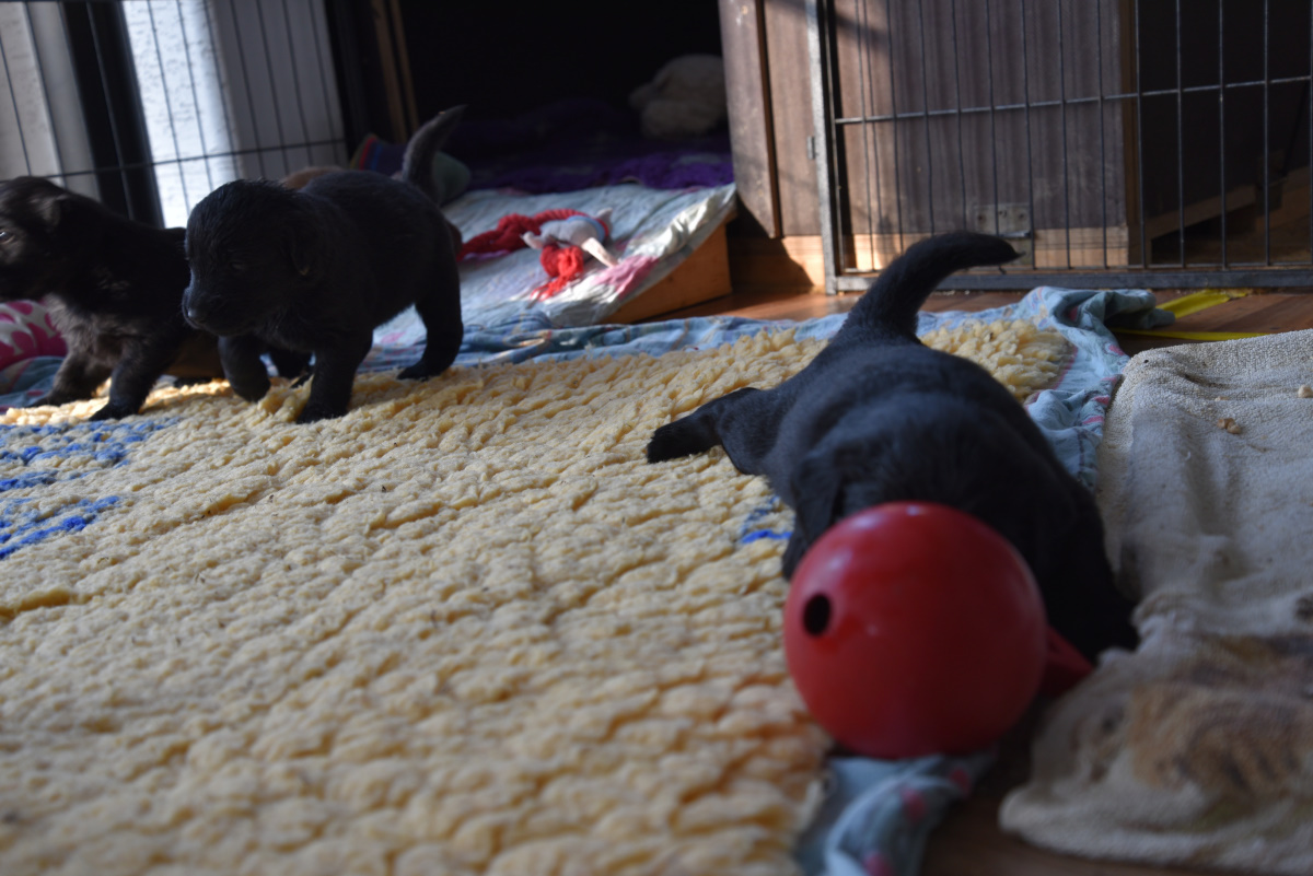 1.4.2019: 3 Wochen sind die Zwerge alt und lernen langsam das Leben außerhalb der Wurfkiste kennen. wir haben die erste Vergrößerung aufgebaut und alle Welpen sind gleich mutig in die große Welt hinaus gegangen. So langsam wird auch Rolle entlastet und wir füttern 3 Milchmahlzeiten aus dem Schälchen zu, welche langsam zu Brei wird! Also kurzum: die Kleinen entwickeln sich prächtig!!! Wie immer sagen Bilder mehr als Worte!
