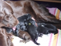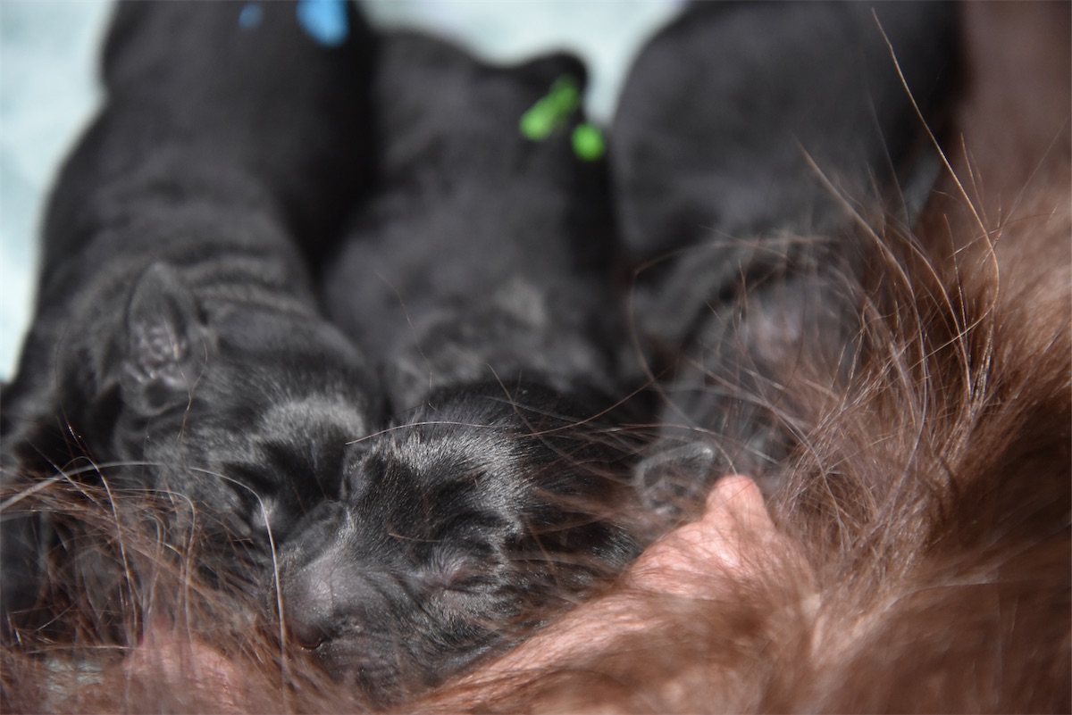 12.3.2019: Nun sind unsere Zwerge 3 Tage alt! Allen geht es gut und sie nehmen gut zu. Noch liegt Lolle ausschließlich in der Wurfkiste und die Babys können ausgiebig bei ihr trinken. In diesen ersten Tagen läuft bei uns die Uhr langsamer und alle genießen diese erste intensive Zeit. Nachts schlafe ich neben der Kiste auf meiner Matratze.