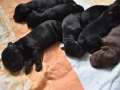25.3.2019: Nun sind unsere 7 Zwerge schon 14 Tage alt. Es ist immer wieder ein Abenteuer zuzusehen wie sie sich entwickeln. Fräulein gelb hatte als erstes ihre Augen geöffnet mit 10 Tagen, nun können alle in die weite Welt blicken, wobei sie noch nicht richtig sehen können. Die Krallen wurden auch schon geschnitten, damit sie die Mama nicht am Gesäuge verletzen. Die erste Entwurmung haben sie auch schon bekommen. In den nächsten Tagen bauen wir den Kindergarten auf und die Welpenkiste wird geöffnet. Aber seht selbst was sie für Fortschritte gemacht haben. Ach ja, die ersten Kontaktaufnahmen untereinander finden auch schon statt.